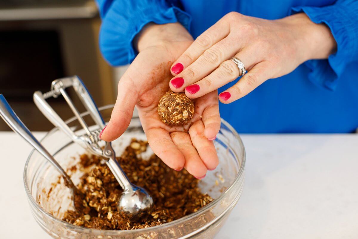- Using a small ice cream scooper or two teaspoons, form into 12 balls and place on a plate lined with wax paper.