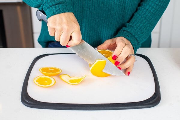 - Using a sharp paring knife, carefully peel the outside of each citrus fruit. Next, thinly slice each and lay on a large platter or plate.