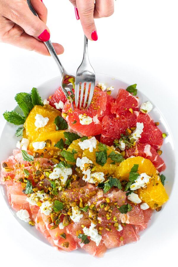This quick and easy Winter citrus salad is topped with goat cheese, pistachios, mint and olive oil. Simple enough for a casual weeknight dinner but elegant enough for entertaining.