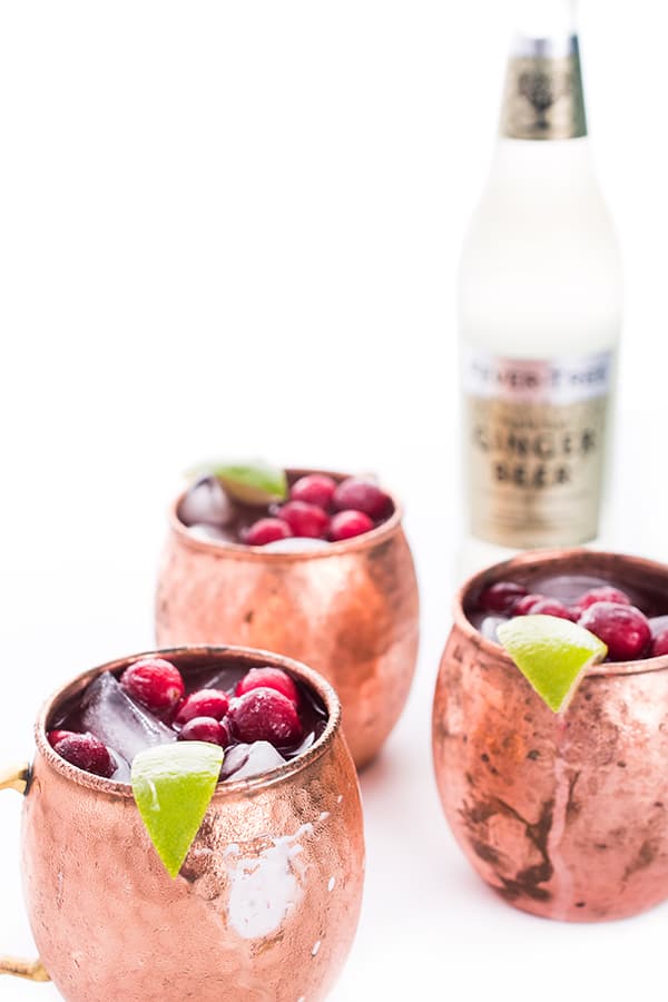 These light and refreshing Moscow mules get a splash of color from cranberry juice. The perfect festive holiday cocktail recipe for entertaining!