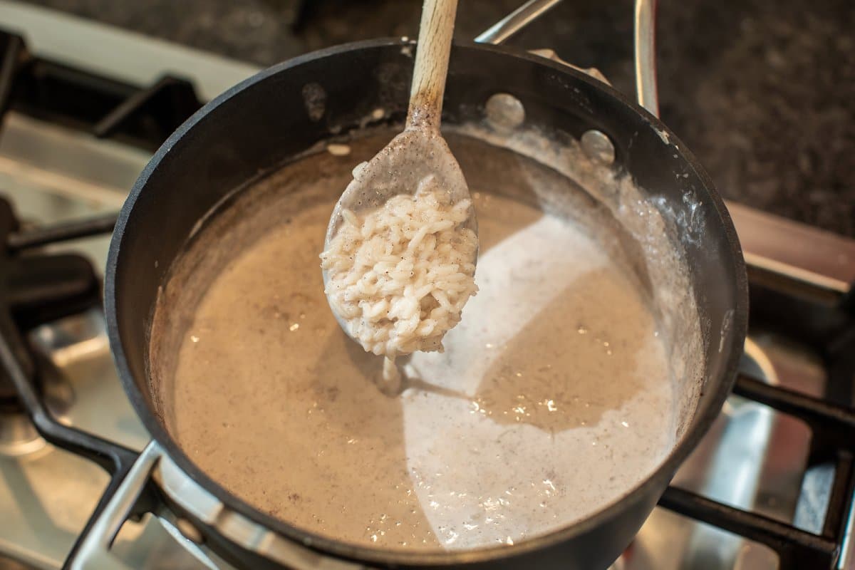 - When the milk comes to a boil, add rice then simmer on low for 20-25 minutes until liquid is mostly absorbed.