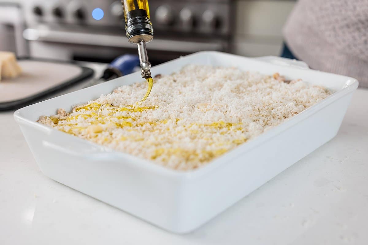 Then drizzle the whole thing with olive oil. Cover in foil, and pop it in the oven at 350 for 30-35 minutes. Remove the foil and continue baking for another 5-10 minutes until top is browned and crispy.