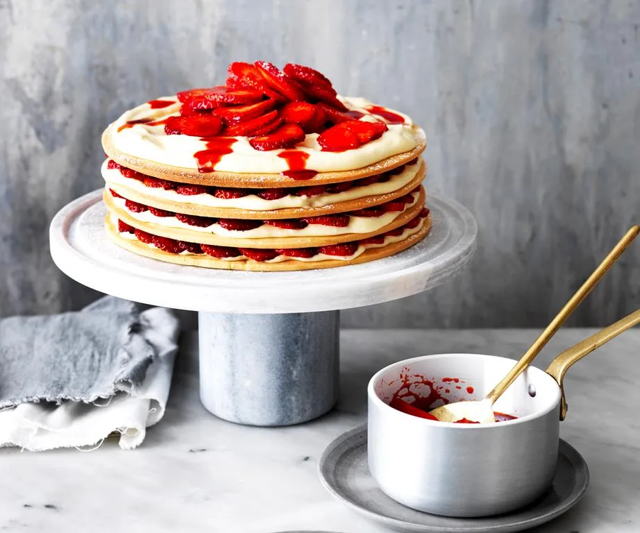 To make this spectacular layered cake, place one shortbread round on a cake stand and top with pastry cream and fresh sliced strawberries. Repeat the layering three more times and drizzle with strawberry compote and syrup. Make on the day of your event to welcome guests into your home with the highly fragrant, sugary scent of berries.