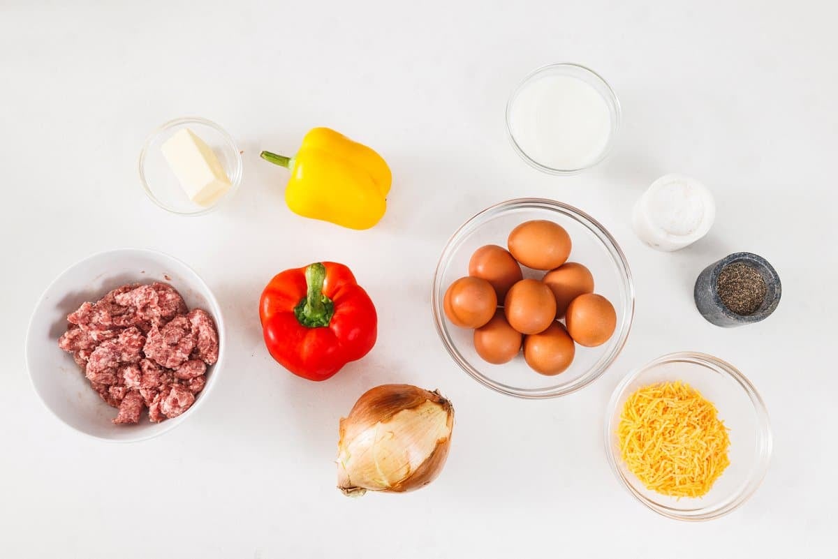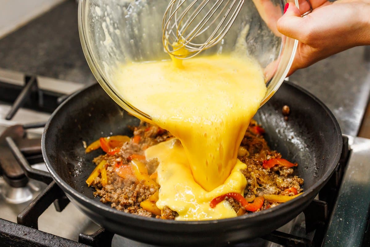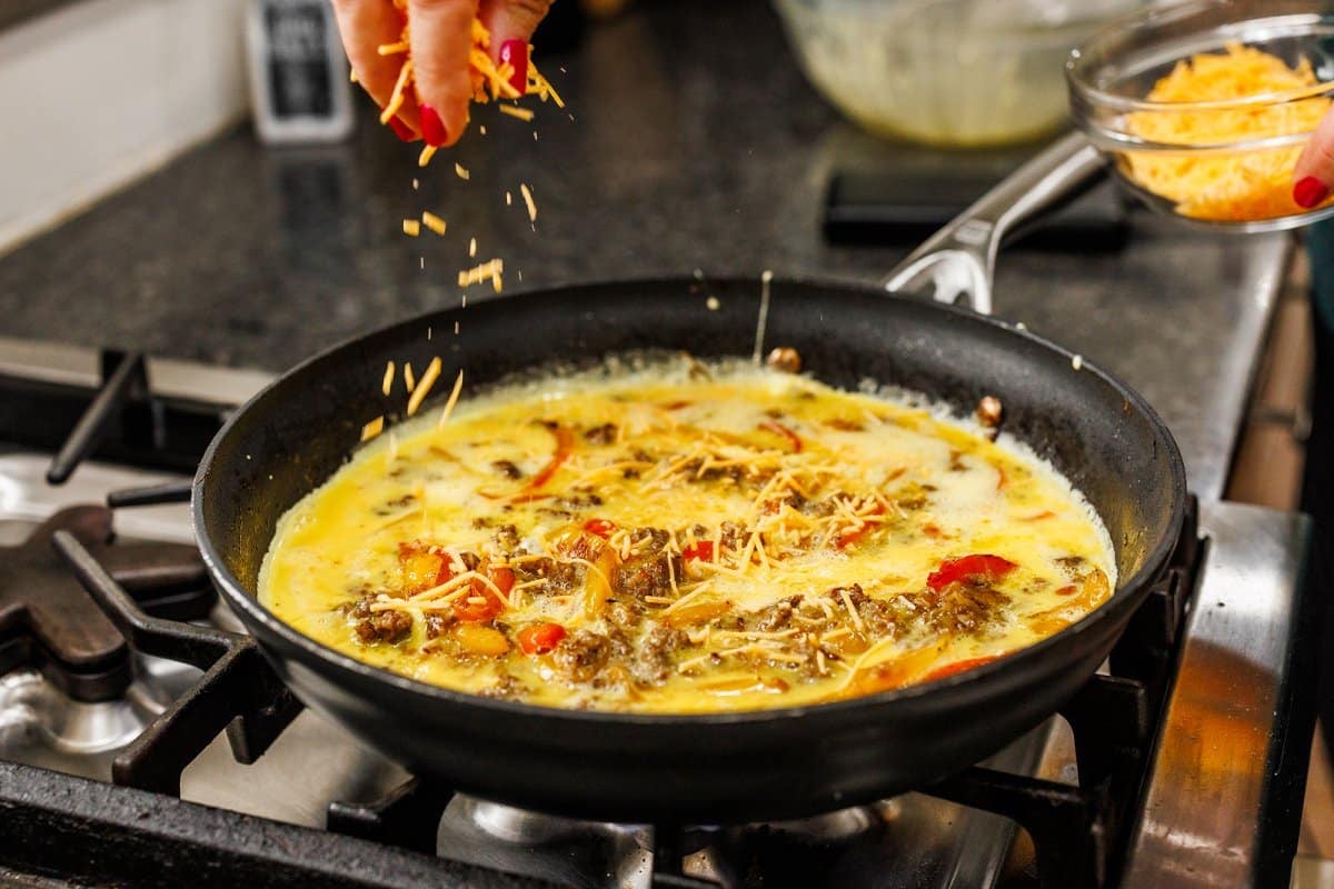 - Pour egg mixture on top of the sausage and veggies in the skillet and stir two or three times to incorporate. Sprinkle cheddar cheese on top then bake in the oven until eggs are cooked through and fully set, about 12-14 minutes.