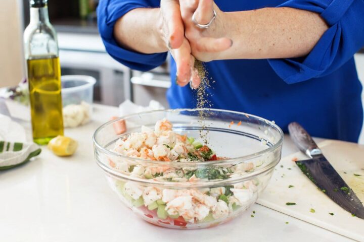 This recipe is easiest if using pre-cooked shrimp. However, raw work just as well. To cook them, simply simmer lemon water, and poach the shrimp until they are a bright pink color. This typically takes around 3-4 minutes. Then, chop them and add the shrimp to the salad just as you would with pre-cooked varieties.