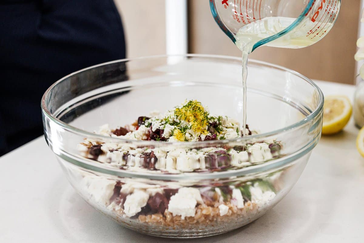 - Add olive oil, lemon zest, lemon juice, salt and pepper to the bowl. Stir well. Check for seasoning and adjust accordingly.