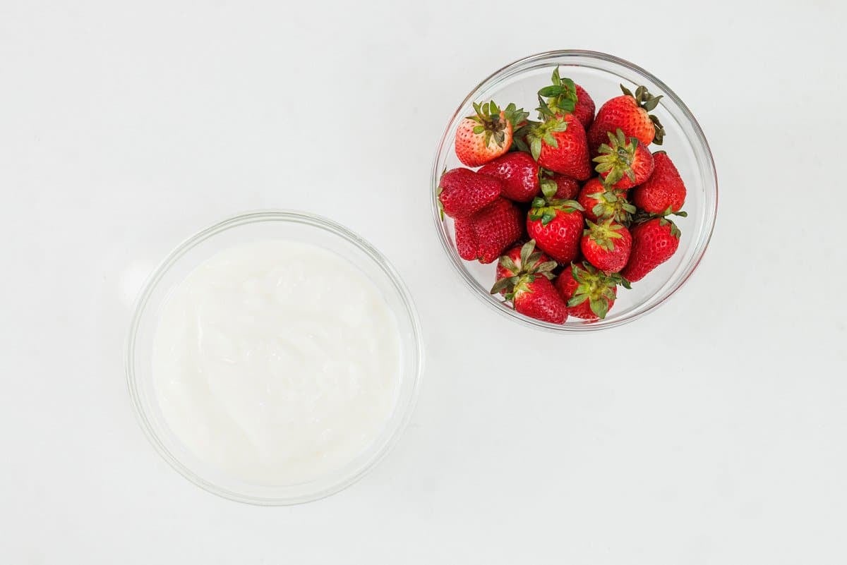 - Place yogurt in a small bowl and dip the strawberries carefully in the yogurt to coat, holding by the stem. Place in a single layer on prepared baking sheet and repeat with remaining strawberries.