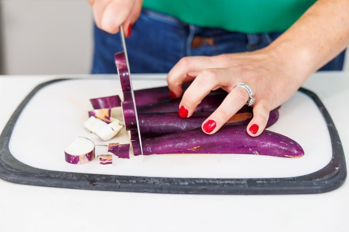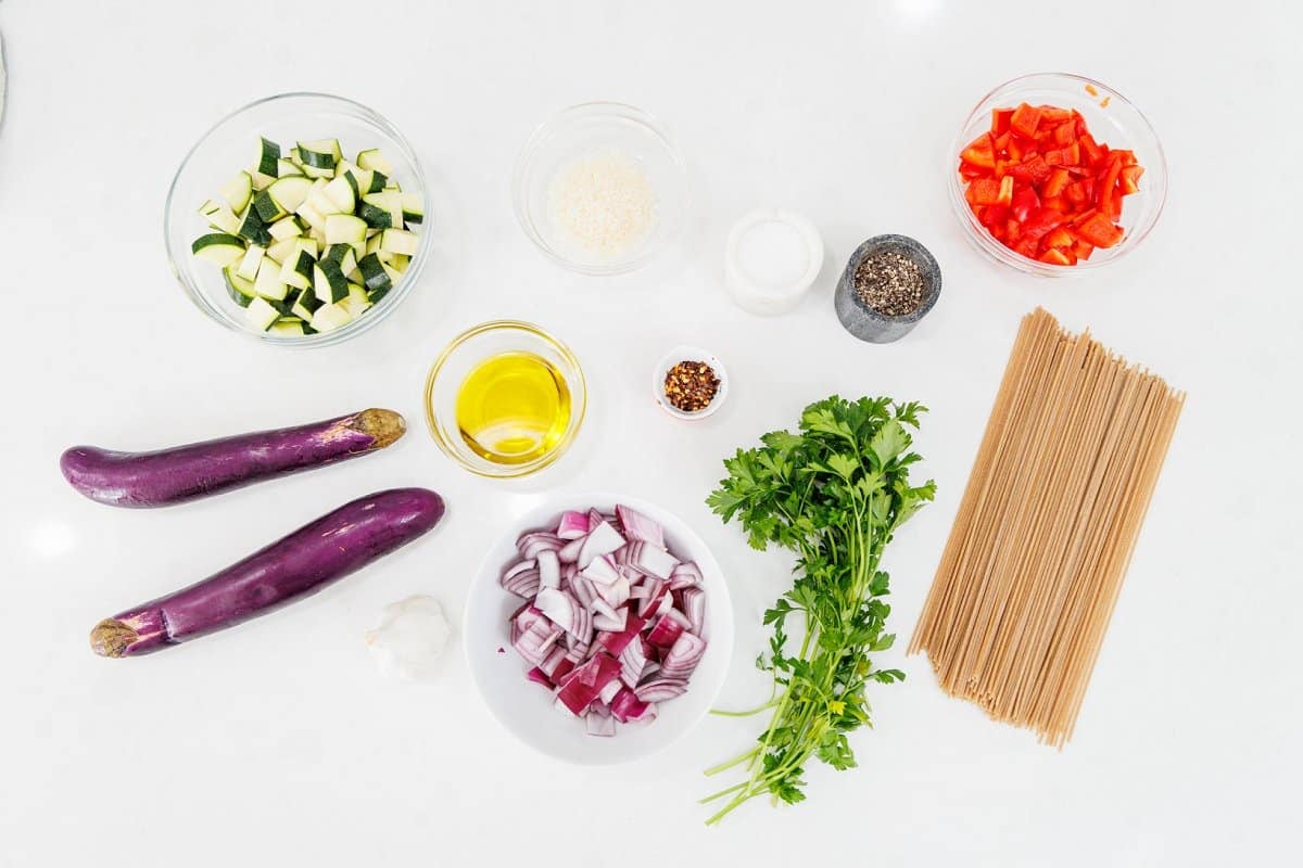 Step 1. Start by prepping your vegetables. I cubed an eggplant, zucchini, red onion, and red bell pepper.