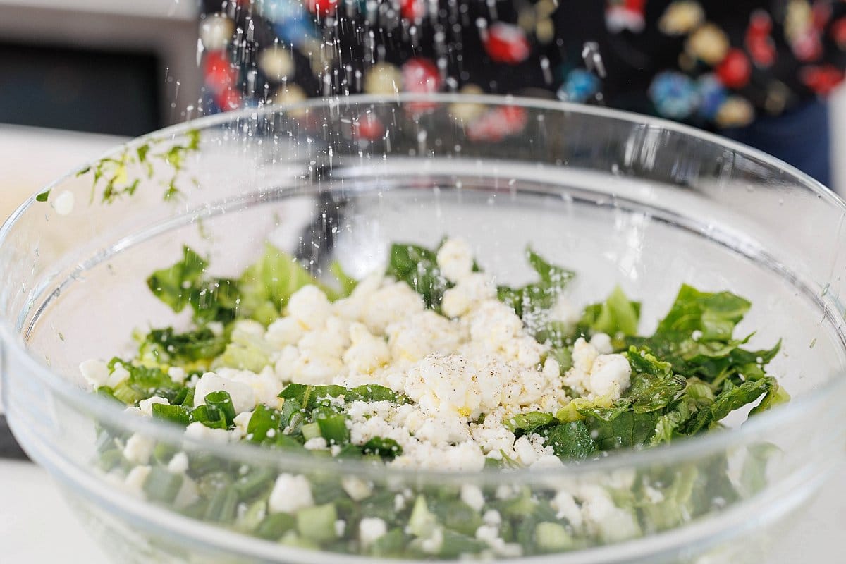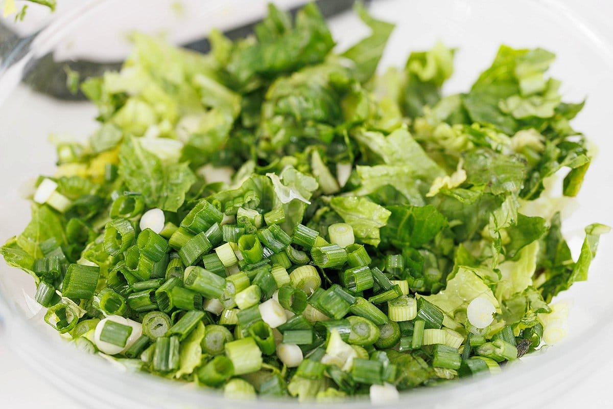 Then you’ll add the chopped romaine lettuce and diced scallions to a large bowl.