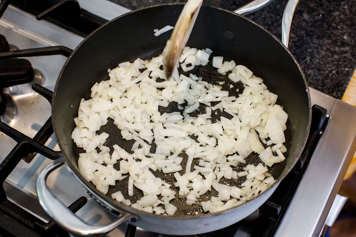 Step 2. In a large sauce pan, melt the butter and sauté the onion until translucent.