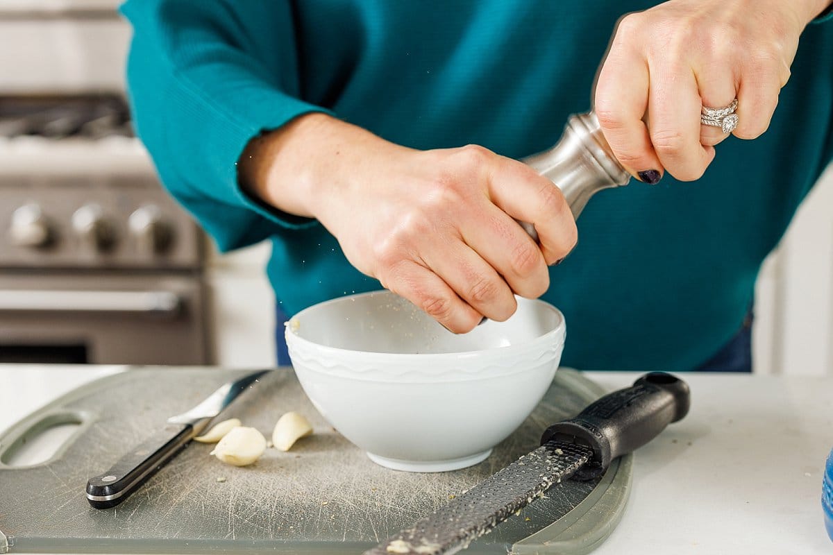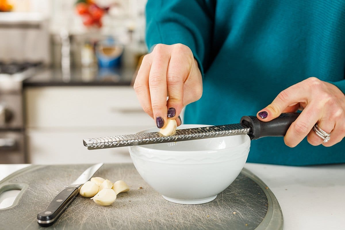 Start your Greek Style Baked Chicken Breasts by making your spice mixture. Freshly grate some garlic into a small bowl.