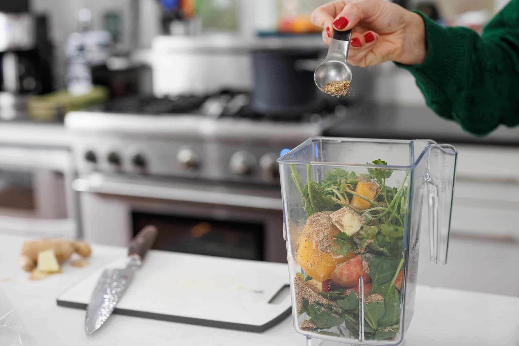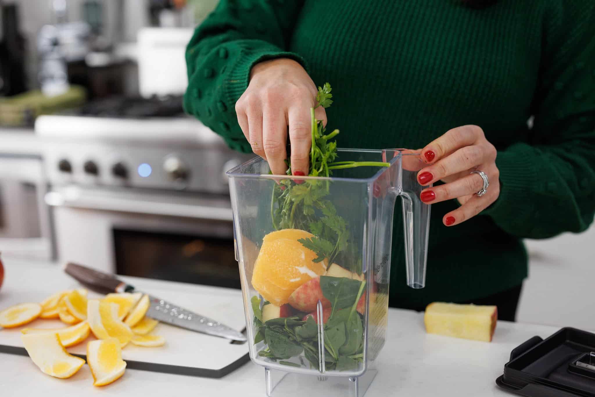 Start your Green Detox Smoothie by preparing your fresh ingredients. Cut up your ginger root and your apple, peel your orange, and wash and trim your spinach and parsley.