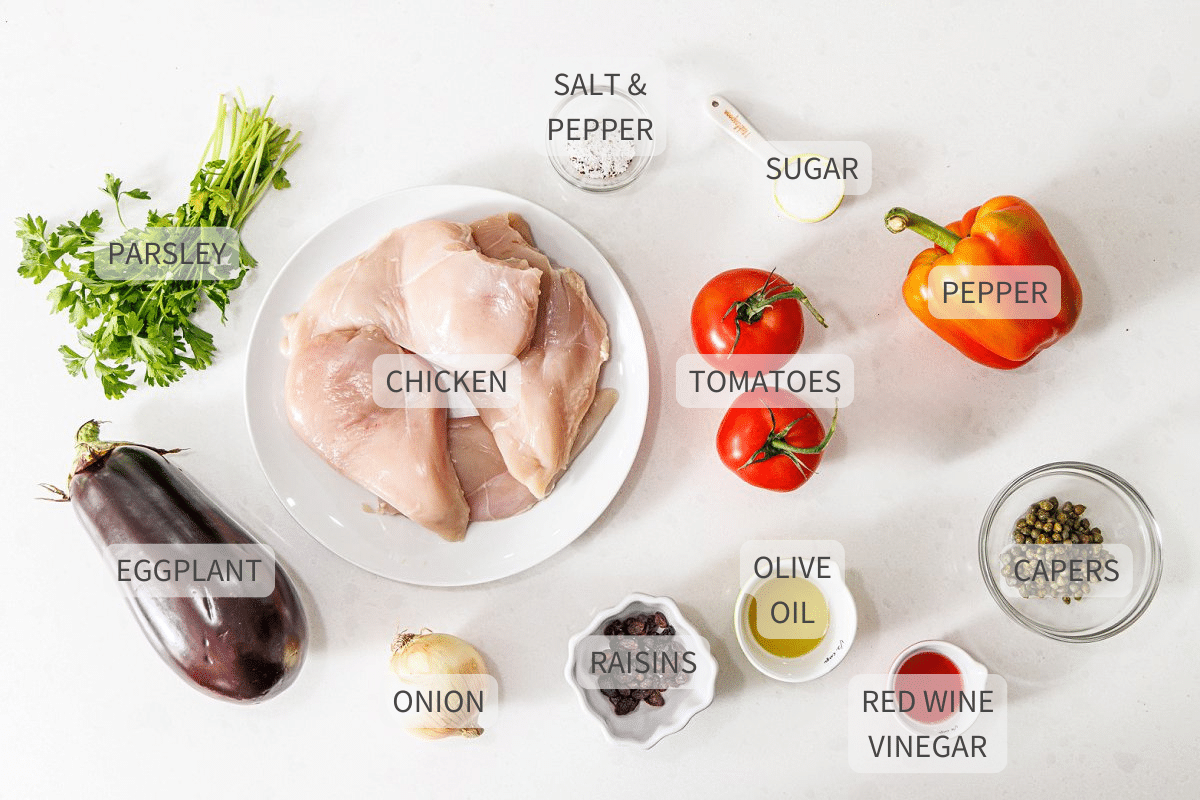 - Vegetables: My caponata is made with eggplant, tomatoes, onion, and red bell pepper mixed with raisins and capers for texture and flavor.