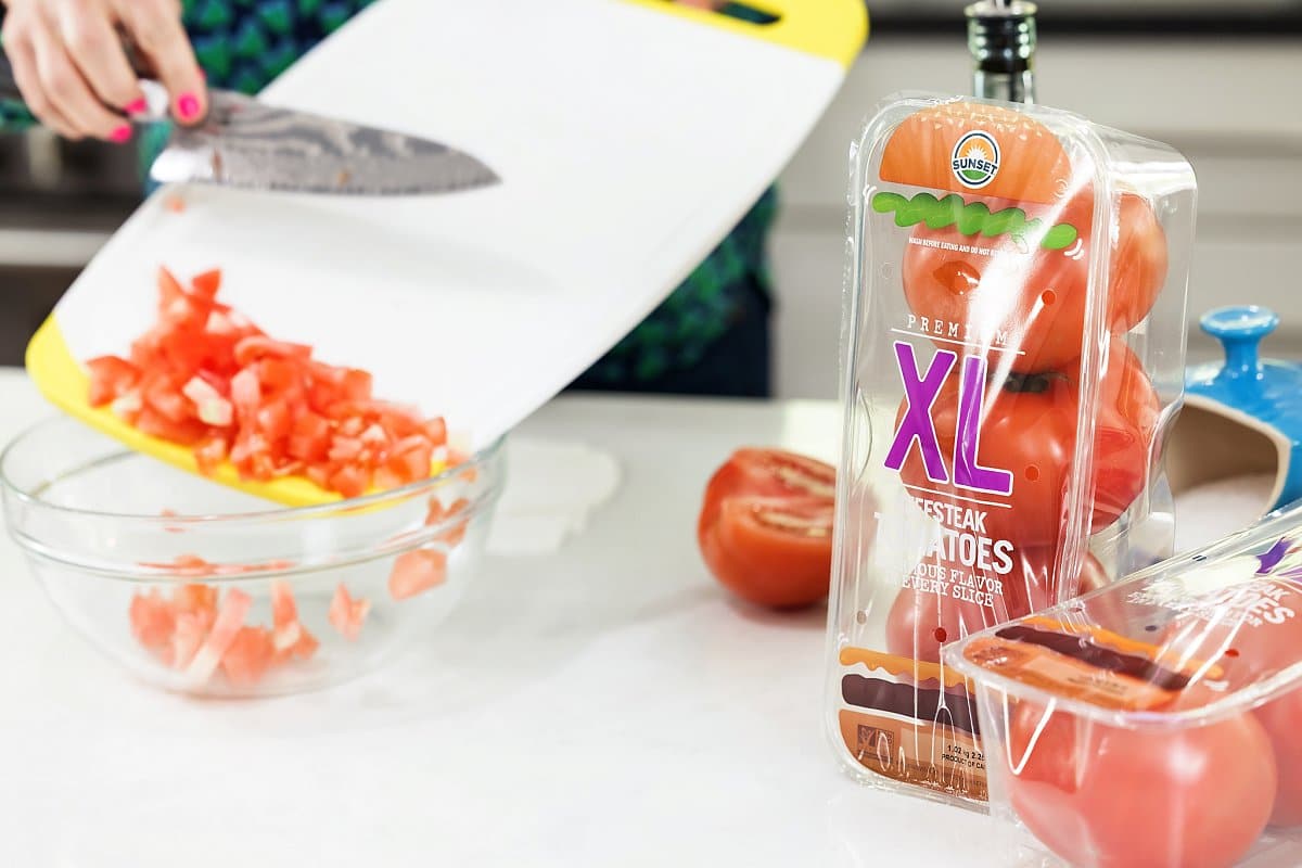 While the chicken is cooking, prepare your fresh tomato basil salsa. Start by dicing two Premium XL Beefsteak Tomatoes and placing them in a medium bowl.