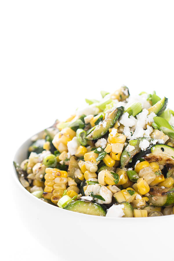 - Remove the veggies from the grill. Uesing a sharp knife, slice the corn into a large bowl. Next, slice the zucchini into bite-sized pieces and add to the bowl. Add all remaining ingredients to the bowl including feta, basil, scallions, lemon juice and remaining 2 tablespoons olive oil. Toss well and season with salt and pepper to taste before serving.