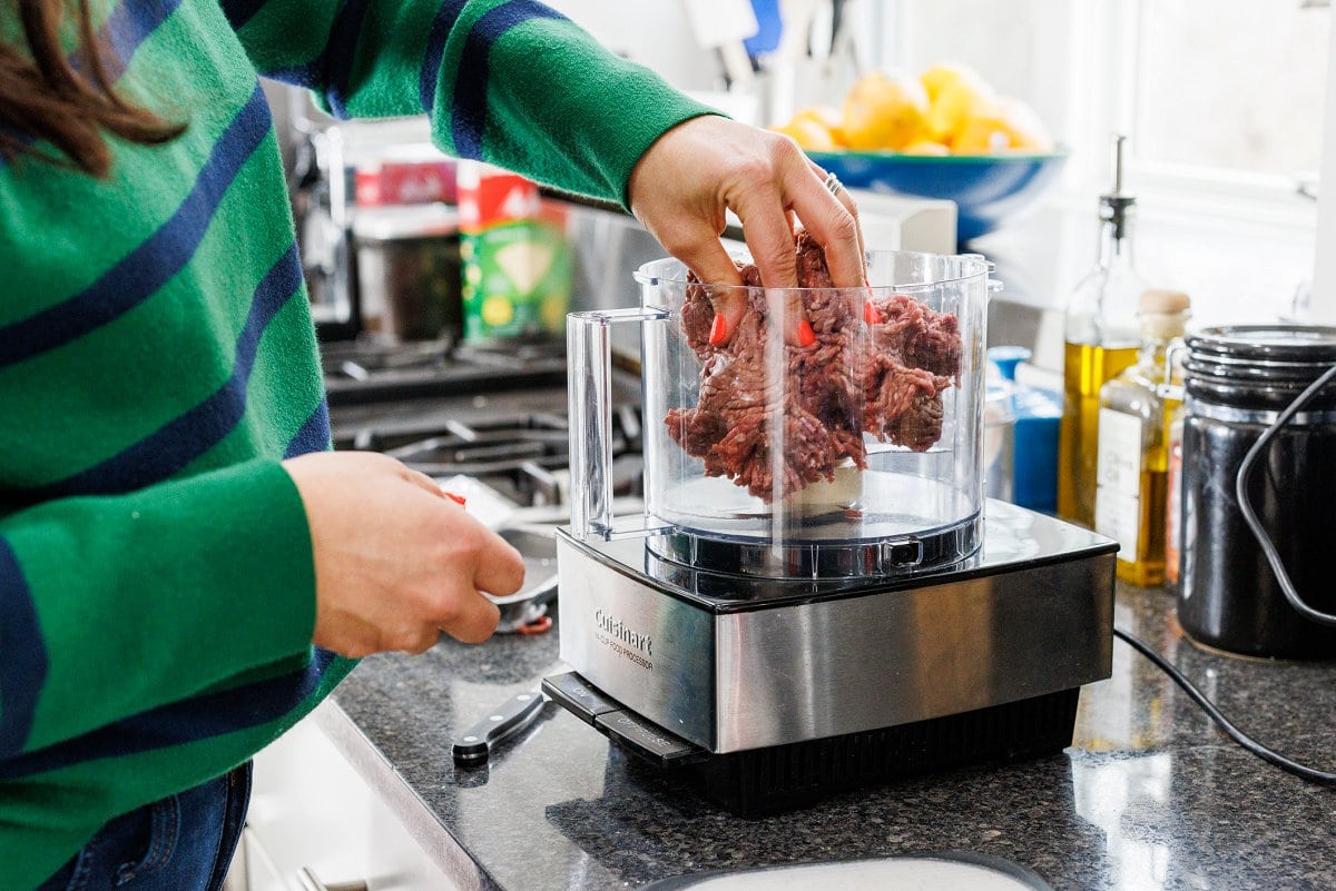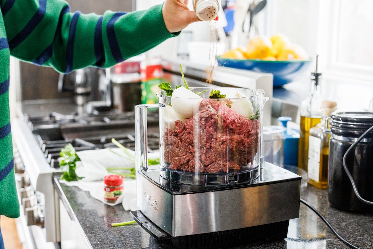 Start your Grilled Lebanese Beef Kafta Patties by putting your ground beef in a large food processor.