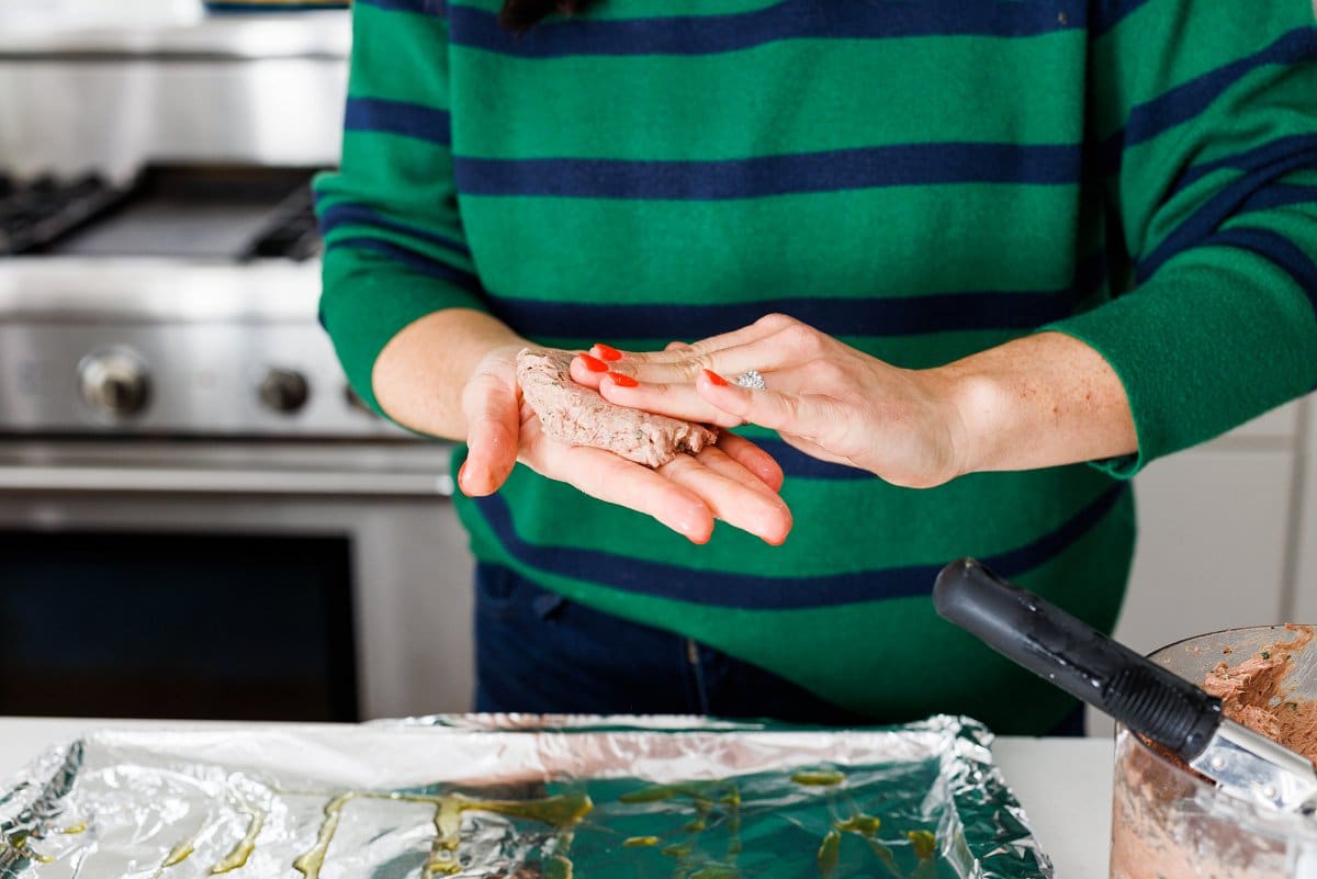Next, use wet or oiled hands to form 12 evenly sized patties.