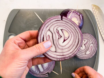 - Peel the red onion then slice into thick rounds. To keep the rounds intact while grilling, insert 2-3 toothpicks around the outside edge; set aside.
