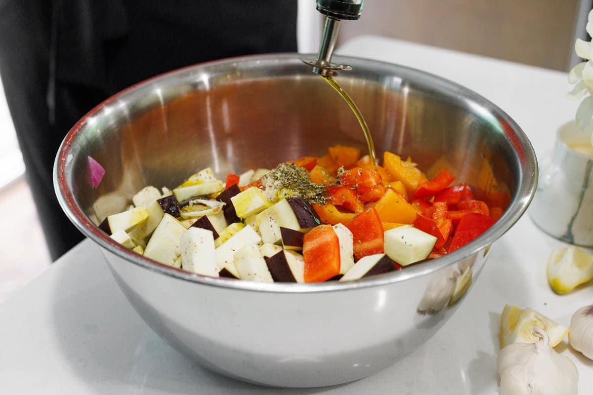 - While the grill is heating and pasta is cooking, whisk together olive oil, garlic, oregano, salt and pepper in a large mixing bowl. Add the vegetables to the bowl (peppers, eggplant and onion) and toss well to coat.
