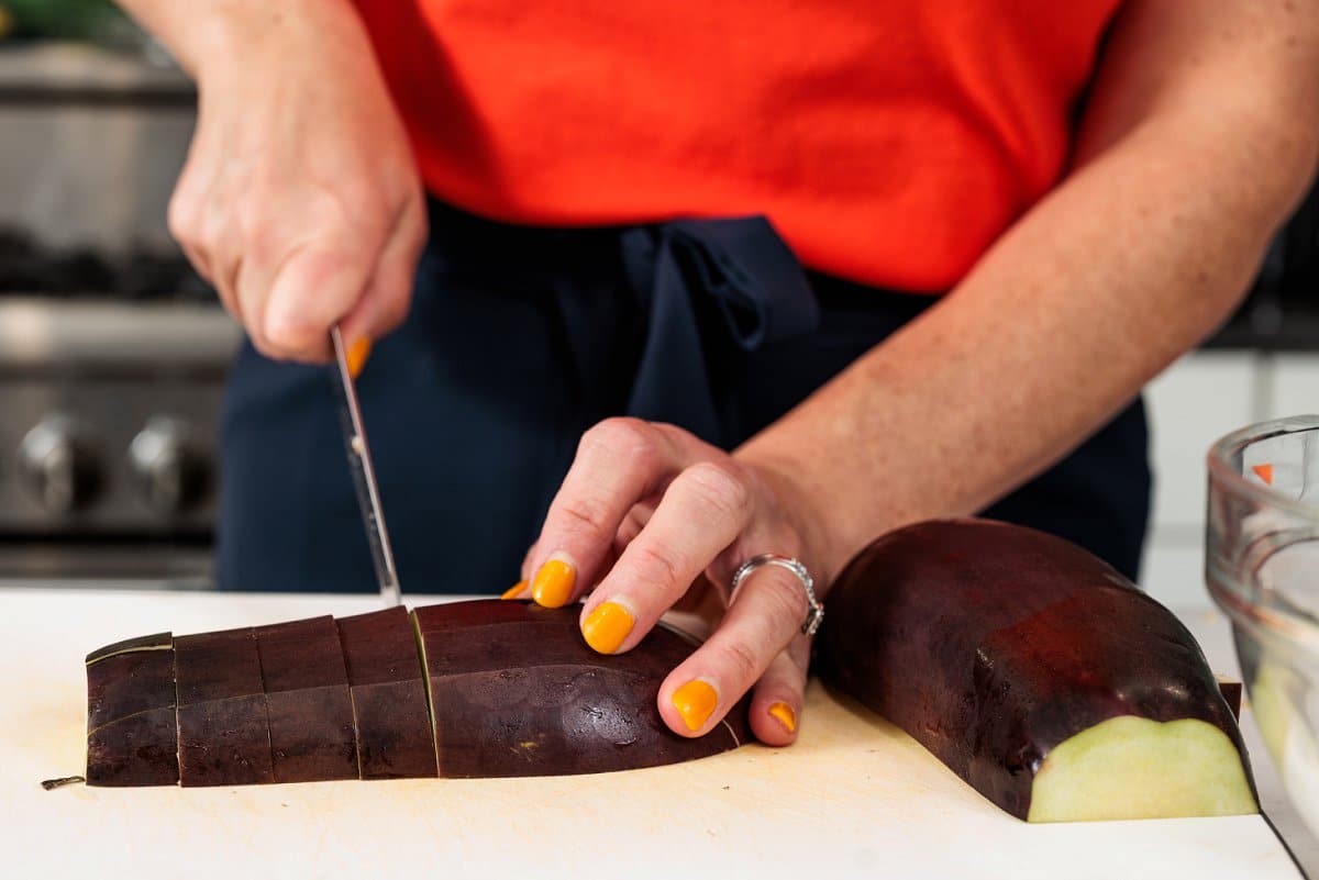 Start your grilled vegetable pasta by washing and cutting your veggies, either into slices or cubes.