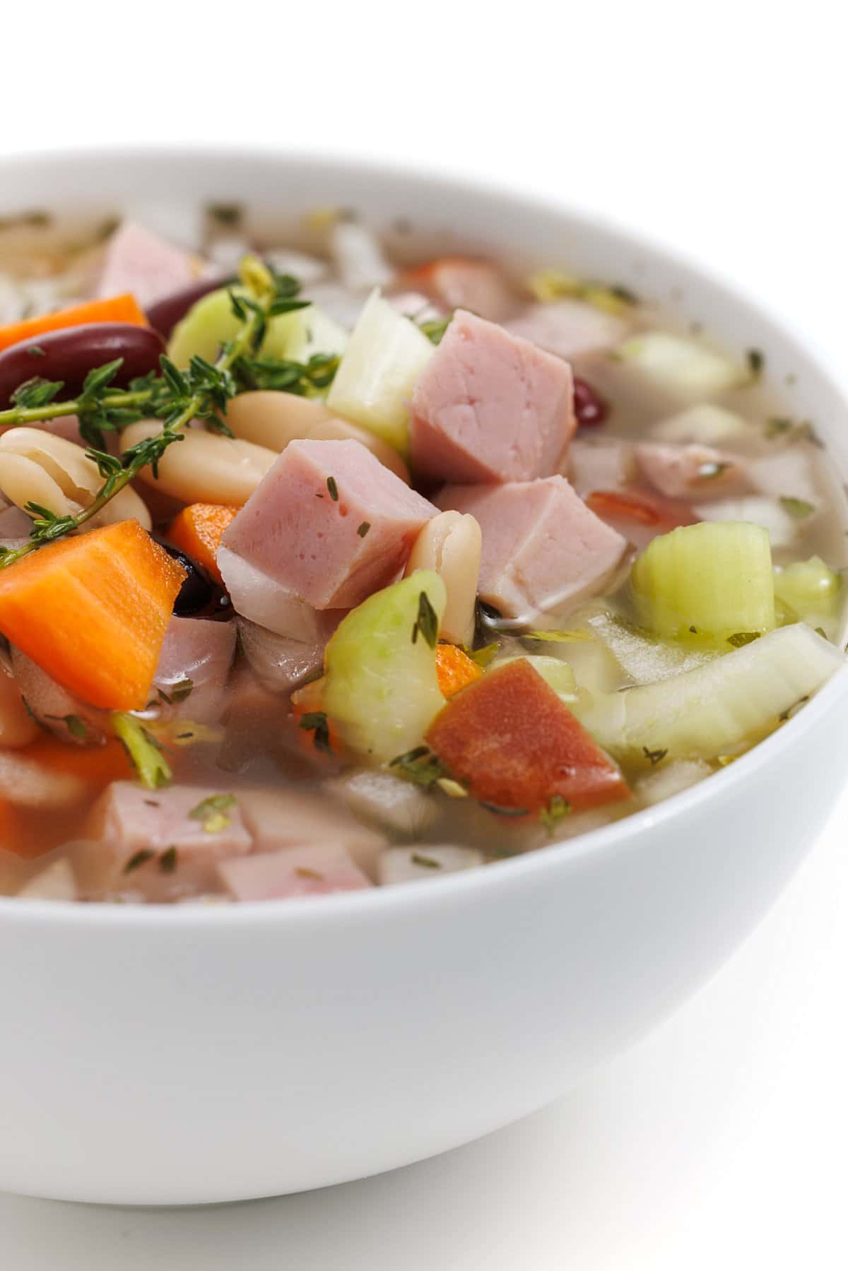 An easy slow cooker dinner recipe that uses leftover ham, this comforting and flavorful ham and bean soup is full of hearty vegetables and smoky aromas.