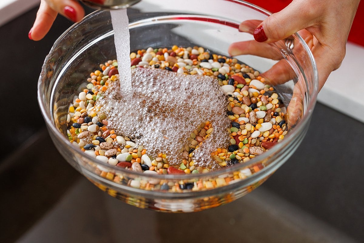 Start your Slow Cooker Ham and Bean Soup by soaking the bean mix overnight.