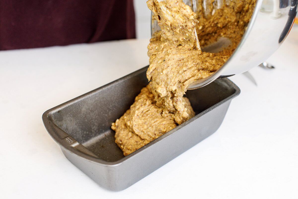 - Pour the batter into the prepared bread pan and bake for one hour or until toothpick comes out smooth. Cool completely before slicing and serving.