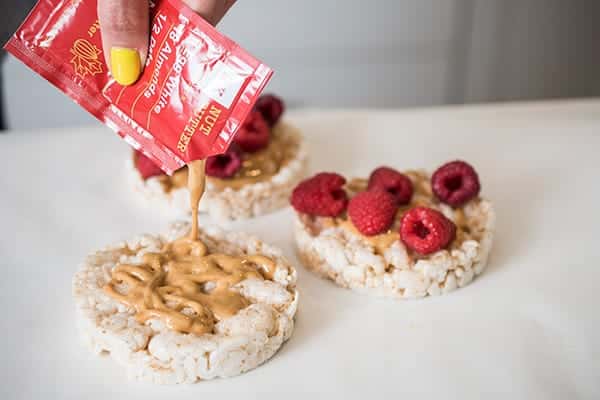 Want a portable snack you can take to work or eat in the car between school drop-offs? Drizzle the maple almond nut butter over a brown rice cake then top with fresh raspberries. If your berries are super ripe, gently mash them with a fork to create a quick version of raspberry preserves creating a fun spin on PB&J.