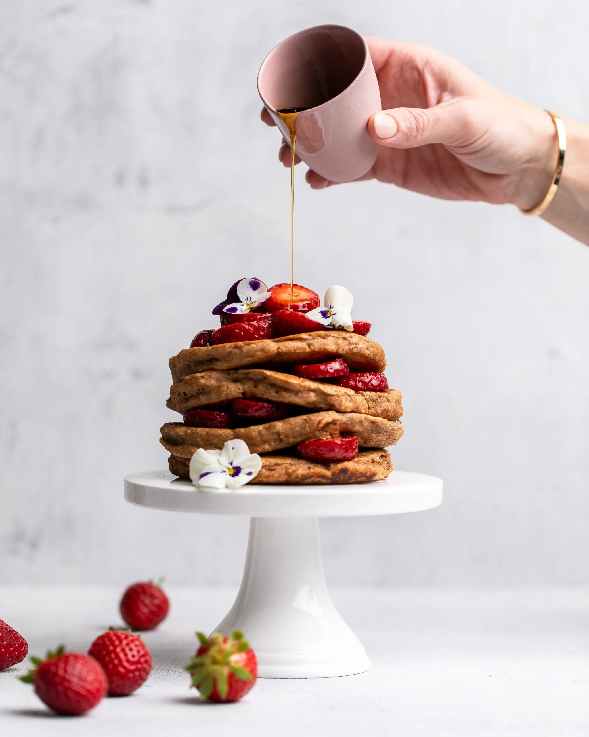 We’ve used spelt flour to create a light pancake which is beautiful topped with roasted rhubarb and a sweet rose syrup. This makes a brilliant weekend breakfast.