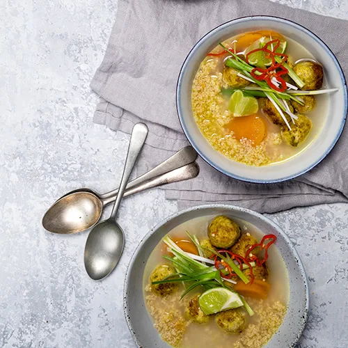 A warming coconut, sweet potato and mince chicken meatball soup with cous cous. The perfect bowl for chilly winter nights.