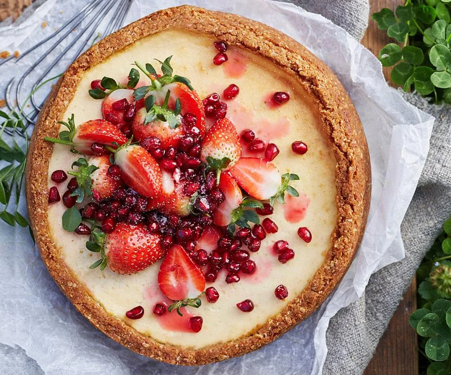 Baked labne cheesecake with strawberry and pomegranate