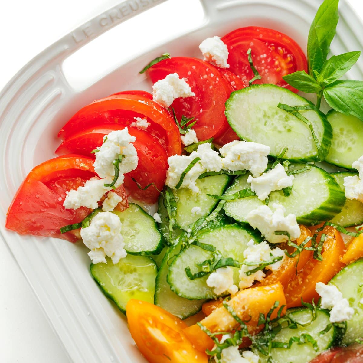 A simple salad made with ripe heirloom tomatoes, garden fresh cucumbers and creamy goat cheese is drizzled with olive oil and a plenty of fresh basil.