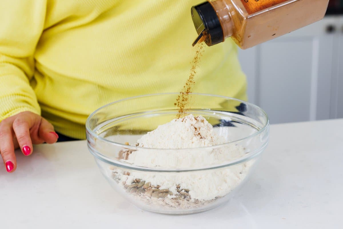 - Preheat oven to 325 degrees. In a large bowl, mix together oats, walnuts, pumpkin seeds, flax, protein powder, cinnamon, and salt. Drizzle in honey and olive oil then stir well to evenly coat mixture.2 cups oats, 1 cup walnuts, 1/2 cup pumpkin seeds, 1/2 cup flax seed meal, 1/2 cup protein powder, 2 teaspoons cinnamon, 1/2 teaspoon salt, 1/3 cup honey, 1/3 cup extra virgin olive oil