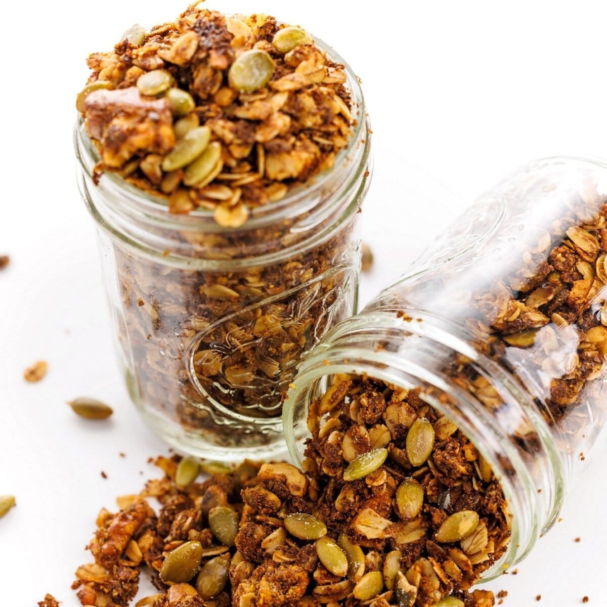 - Pumpkin seeds: Rich in vitamins and minerals, and much easier to eat in their raw form, they add a nice change in texture to the granola.