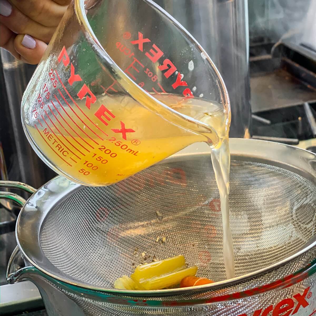 When it’s time to strain the chicken stock from the vegetables and bones, place a fine-mesh strainer over a large liquid measuring bowl.