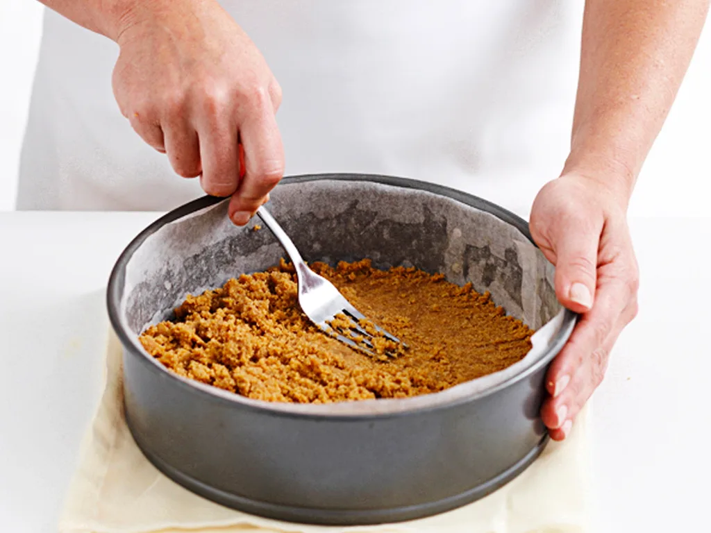 • Try to avoid making the crumb mixture too thick where the side meets the base of the tin. Use the side of a glass to press and smooth the crumbs firmly onto the side of the tin. Use the base of the glass to press the crumbs firmly over the base of the tin.