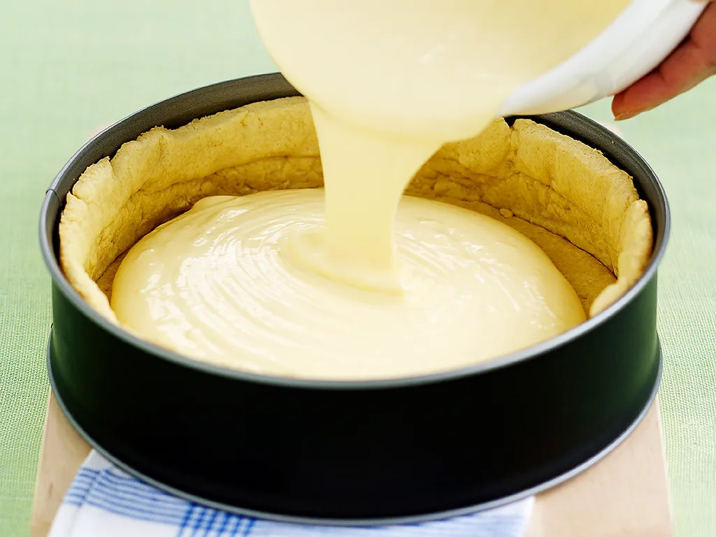 Some recipes will instruct you to bake your cheesecake in a waterbath. The results will be better all round; the cheesecake will have a wonderfully rich, creamy texture because it’s been baked in a moist environment at a constant temperature. The temperature in the centre of a cheesecake should not exceed 60°C. The cake should look a bit shaky in the middle when it’s done; it will set and become firm on cooling. Cracks should be a thing of the past if you use this method, and there’s no need for oven-cooling either.