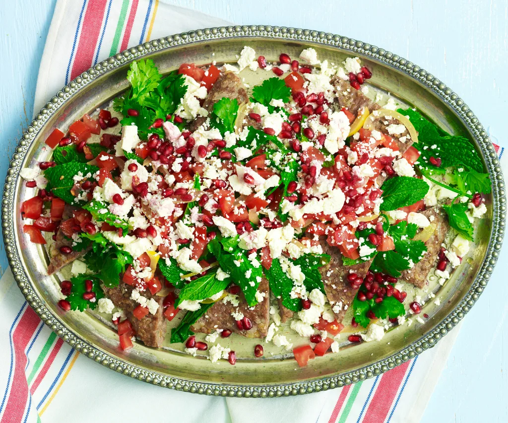 Of course, salad is not the only place where we might see burghul. It’s also a key ingredient in kibbeh – where it’s soaked and combined with finely ground mince and spices. Balls of kibbeh are stuffed with a seasoned mix of vegetables and nuts and then fried, or the kibbeh mixture can be baked in a pan like this kibbeh recipe with tomato and pomegranate salad.