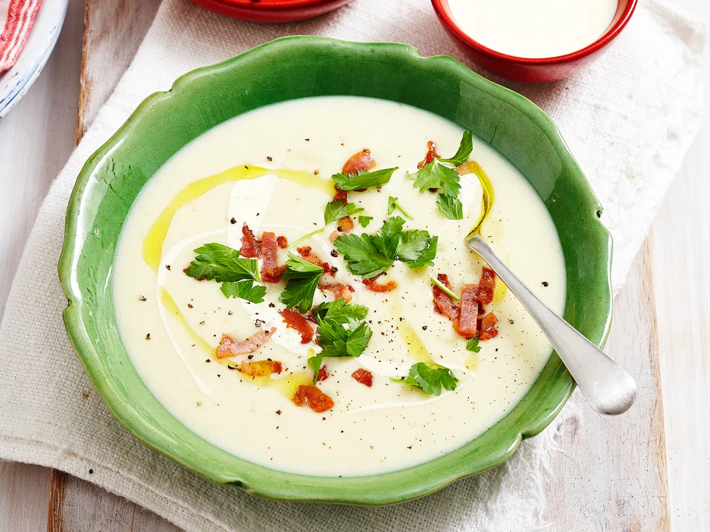 This creamy potato and leek soup is a great tonsil-friendly option. Serve cooled, without the toppings.