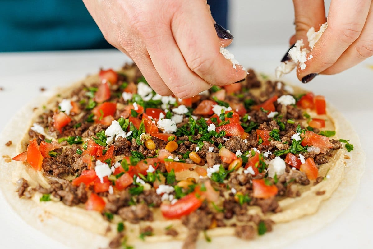 Hummus is spread on a flour tortilla and topped with hushwee (meat and pine nut mixture), tomatoes, and feta then wrapped tightly and sliced. These flavor-packed hummus and hushwee pinwheels are perfect for stashing in lunchboxes or serving as a party appetizer or after-school snack.