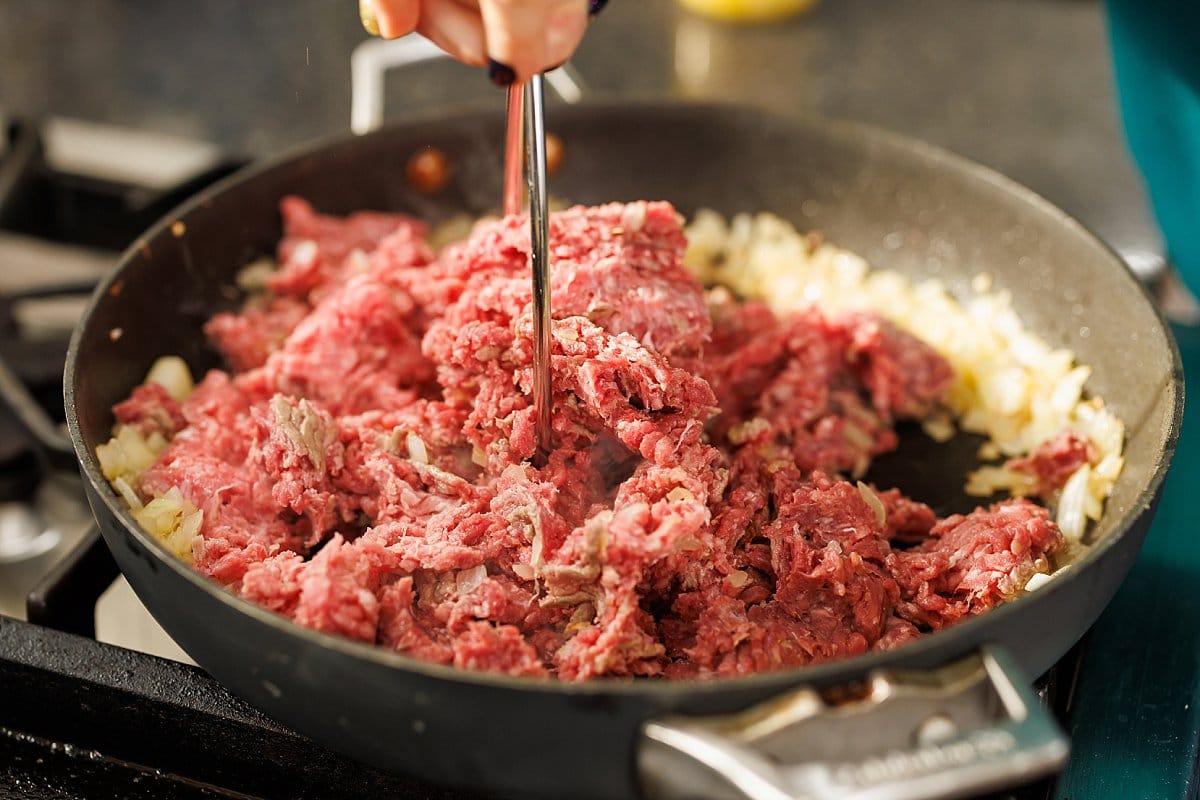 Add the ground beef and break it up while it browns.