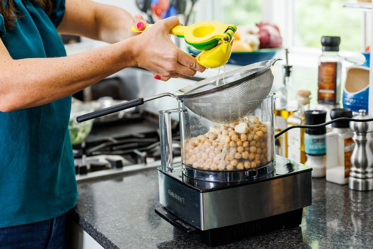 Finish with the tahini sauce and ice water. I like to drizzle in the olive oil as it’s blending, and you’ll puree until smoooth.