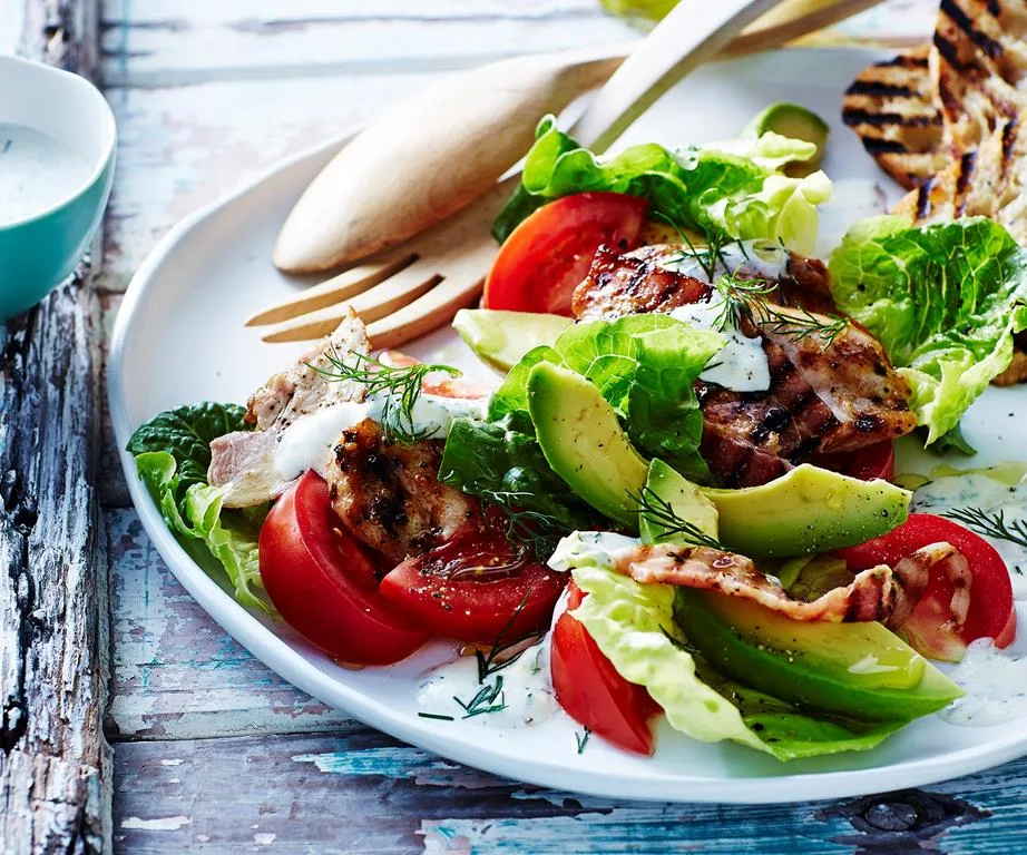 This delicious salad combines all the flavours of a BLT sandwich (bacon, lettuce and tomato) with juicy chilli chicken pieces.