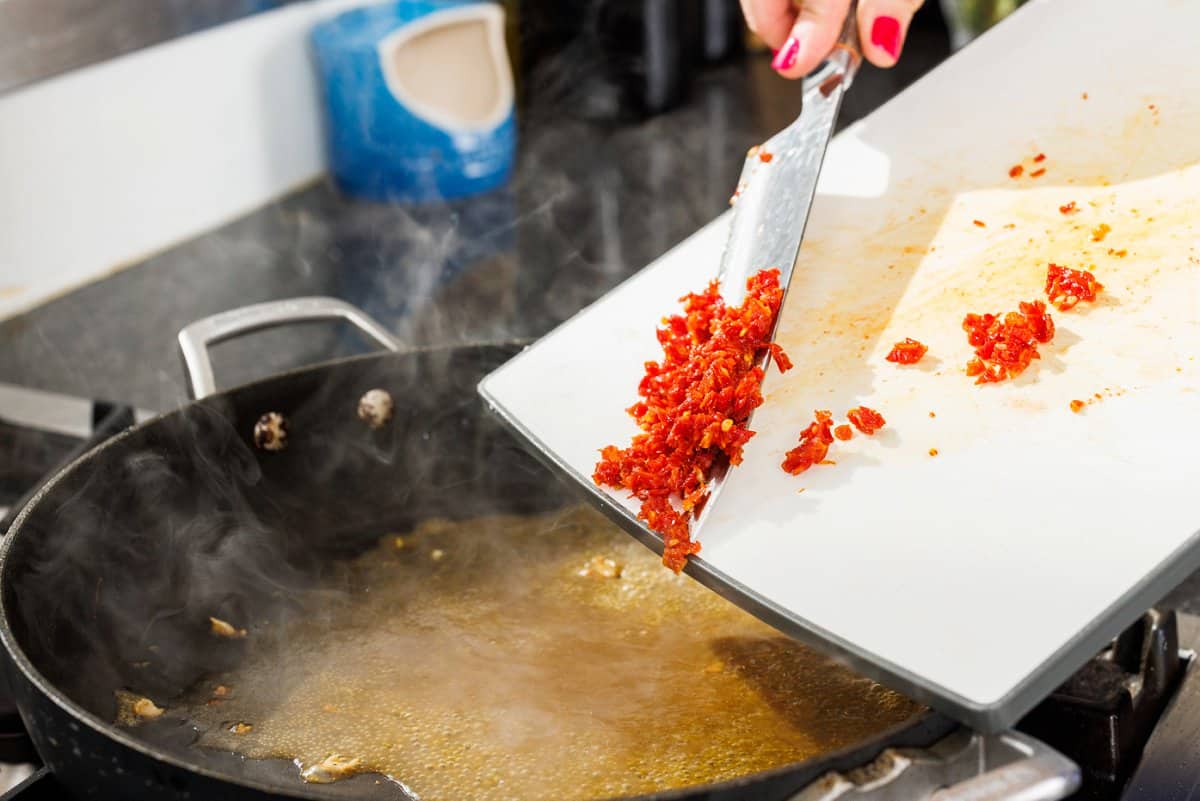 - Add the white wine to the hot pan to deglaze, using a wooden spoon to scrape up all the browned bits. Add the garlic to the pan and heat until fragrant, about 30 seconds, before stirring in the artichoke hearts, sun-dried tomatoes and reserved chicken cubes.