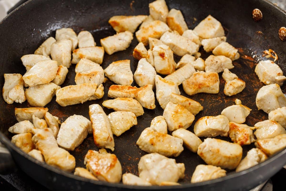 - Sprinkle chicken cubes with salt and pepper and add to the hot pan. Saute chicken until browned, about 5-7 minutes, then remove from pan using a slotted spoon; set aside.