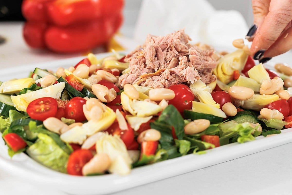 This light and refreshing Italian chopped salad with cannellini beans, tuna, and artichokes is bursting with flavor and packed with protein to give you energy all afternoon long.