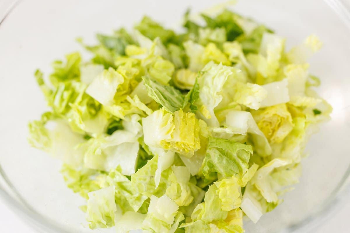 Start your Italian garden salad by washing and drying your produce. Then roughly chop your romaine lettuce.