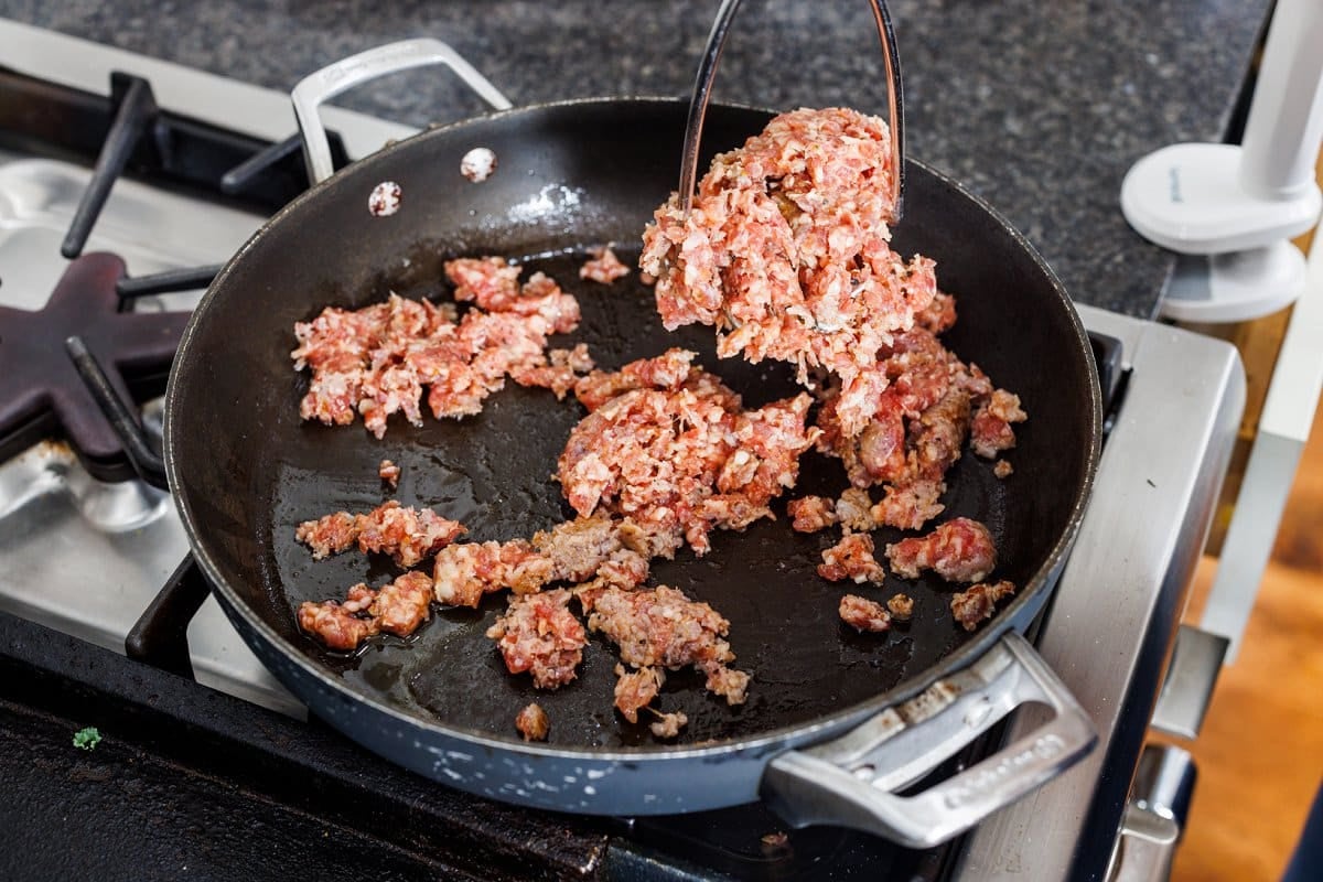 Cook your Italian sausage over medium-high heat with the minced garlic, breaking up into smaller bits as it browns. Once it’s finished, add it to the bowl with the farro.