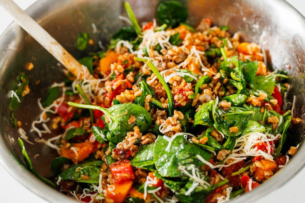 - Stir in spinach during the last minute of cook time. Remove from heat and place cooked squash and wilted spinach to the bowl with the farro and sausage.