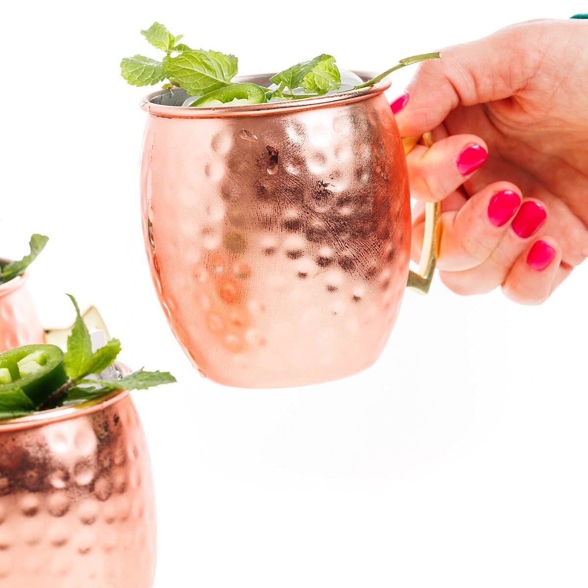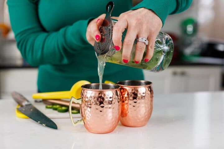 Whenever I try a new cocktail at a restaurant, I love going home and making it on my own. These spicy Jalapeño Moscow Mules were inspired by just that. For me, that typically means dialing down the sweetness, doubling the citrus, and kicking up the spice level a bit. I like my cocktails zesty, spicy, and not very sweet. If you’re like me, then you’ll love this take on a Moscow Mule! Or one of my other mules, like Pomegranate Moscow Mule or Spicy Apple Moscow Mule.